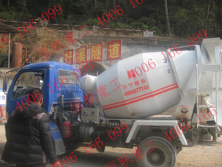 我公司針對隧道入口坡度大的施工環(huán)境,采用四驅(qū)工程車改裝小型混凝土攪拌車,爬坡能力大,車身矮,車長短,可以在隧道內(nèi)靈活行走轉(zhuǎn)向調(diào)頭。