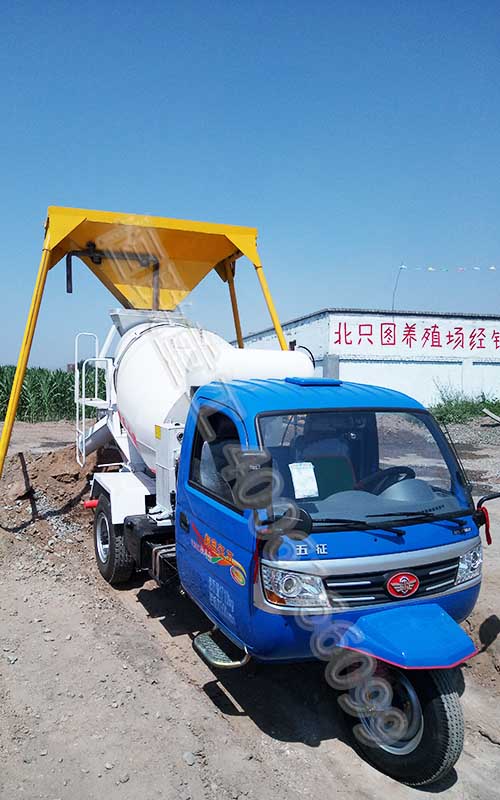 準(zhǔn)備攪拌干料的三輪攪拌車(chē)