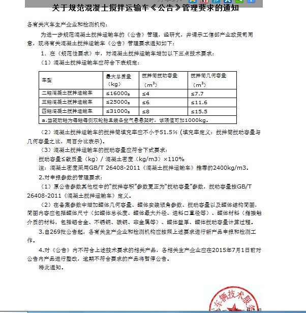 中機車輛技術服務中心印發(fā)中機函,7號文,中明確了混凝土攪拌車的三點技術要求,并于2015年7月1日對攪拌車公告產(chǎn)品進行整改。